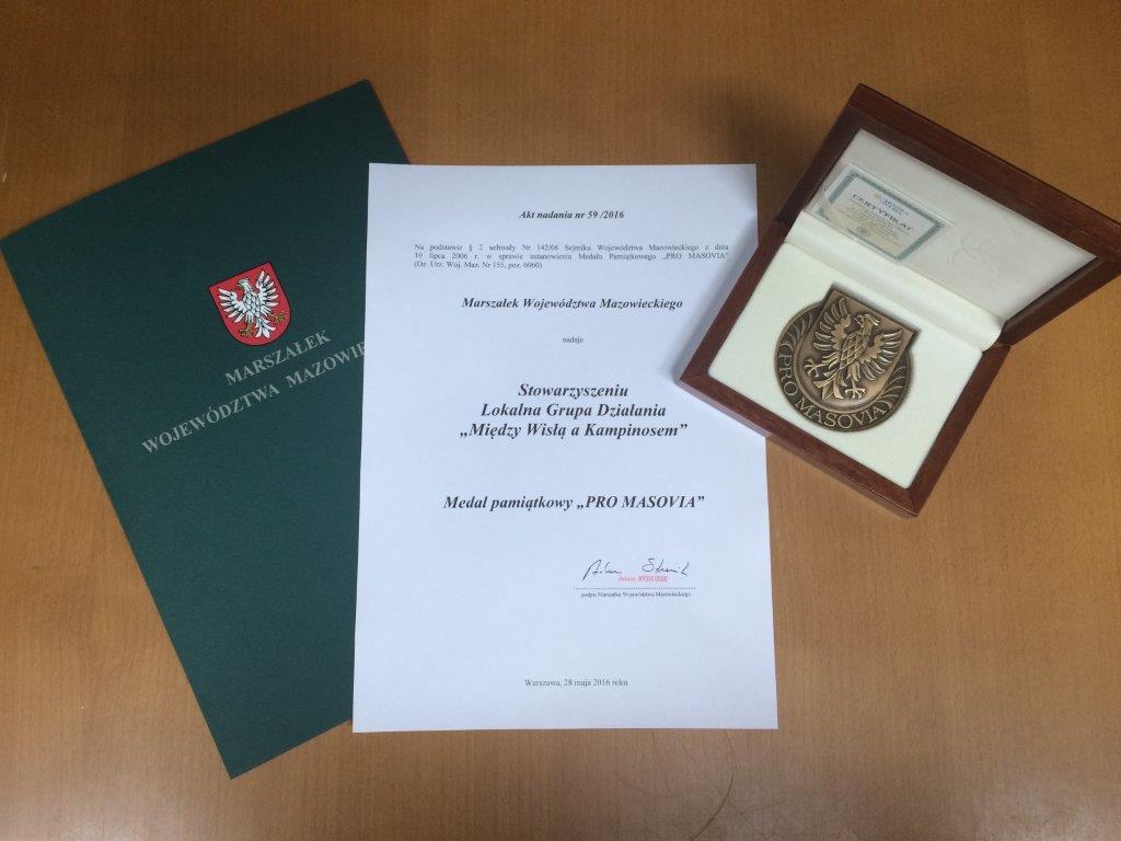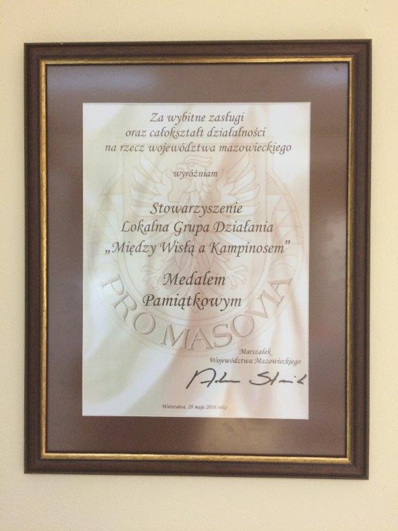 Podczas tego wydarzenia zostały wręczone medale pamiątkowe PRO MAZOVIA. Za wybitne zasługi oraz całokształt działalności na rzecz województwa mazowieckiego medalem tym zostało wyróżnione nasze Stowarzyszenie ,,Między Wisłą a Kampinosem’’ działające jako Lokalna Grupa Działania oraz został wyróżniony Pan Paweł Białecki – Prezes Zarządu, jednocześnie Wicestarosta Powiatu Warszawskiego Zachodniego.